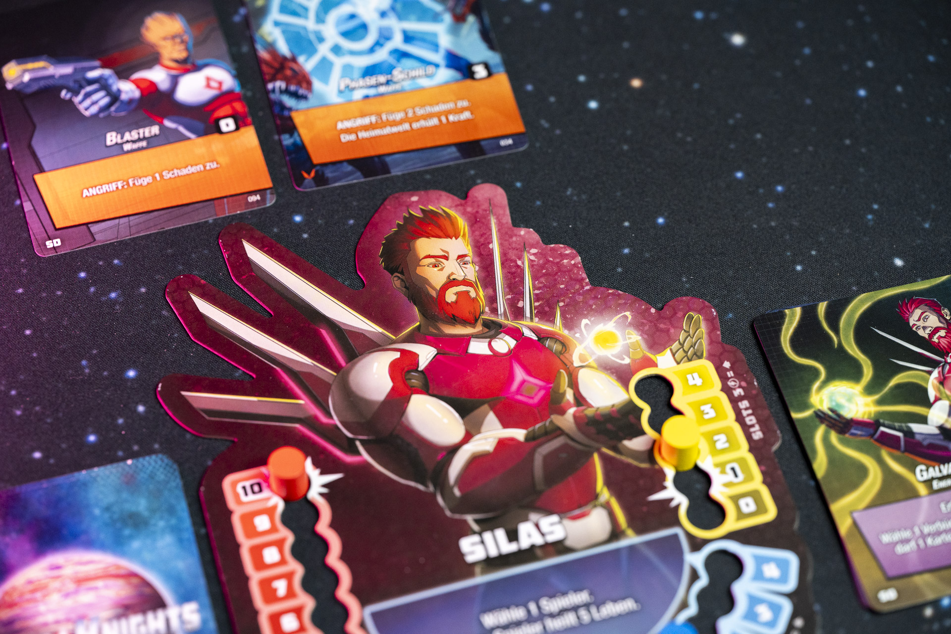 Das elegante Waffenslot-System ersetzt das Rissmagie-Management aus Aeon’s End. In Astro Knights stellt ihr euch strategischen und taktischen Herausforderungen mit noch geringeren Hürden im Spielablauf und -aufbau. Die Herausforderung ist da, wo sie hingehört: Nicht in den Regeldetails oder dem Setup, sondern in der Entscheidung, ob eine Technologie regulär gespielt oder überladen werden soll, ob es einen Waffenslot mehr braucht, wann ihr eure Spezialfähigkeiten nutzt und in welcher Reihenfolge Karten ausgespielt werden müssen.