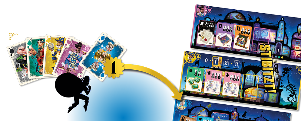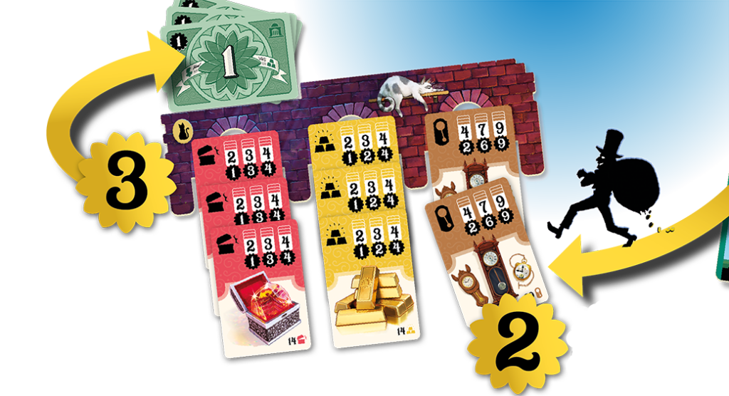 Alle erbeuteten Gegenstände lagerst du auf deinem persönlichen Versteck-Tableau. Um richtig Kasse zu machen, musst du jedoch passende Sets aus Beutestücken sammeln und diese im richtigen Moment verkaufen. Wer am Ende des Spiels den meisten Reichtum „umverteilt“ hat, gewinnt die Partie!