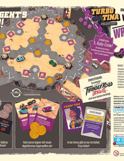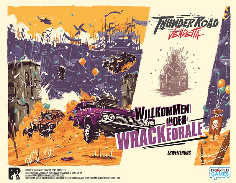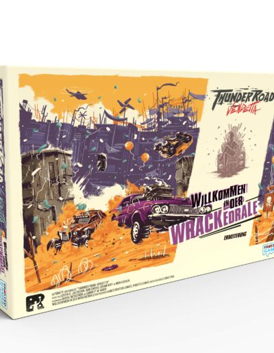 Thunder Road Vendetta: Willkommen in der Wrackedrale von Rob Daviau, Justin D. Jacobson, Brian Neff und Noah Cohen ist eine Erweiterung für Thunder Road Vendetta: Maximum Chrome, die das postapokalyptische Rennen in eine brutale Arenaschlacht für 2-5 Spieler ab 10 Jahren verwandelt. Deine Aufgabe: Sammle das meiste Chrom und werde zum Publikumsliebling!