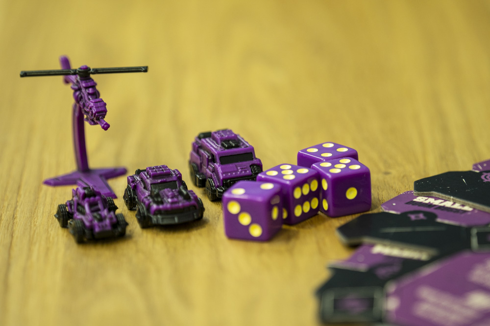 • 1 weitere Auto-Crew bestehend aus 1 Kommandotafel, 3 Cockpits, 4 Bewegungswürfeln, 3 Autos und 1 Helikopter