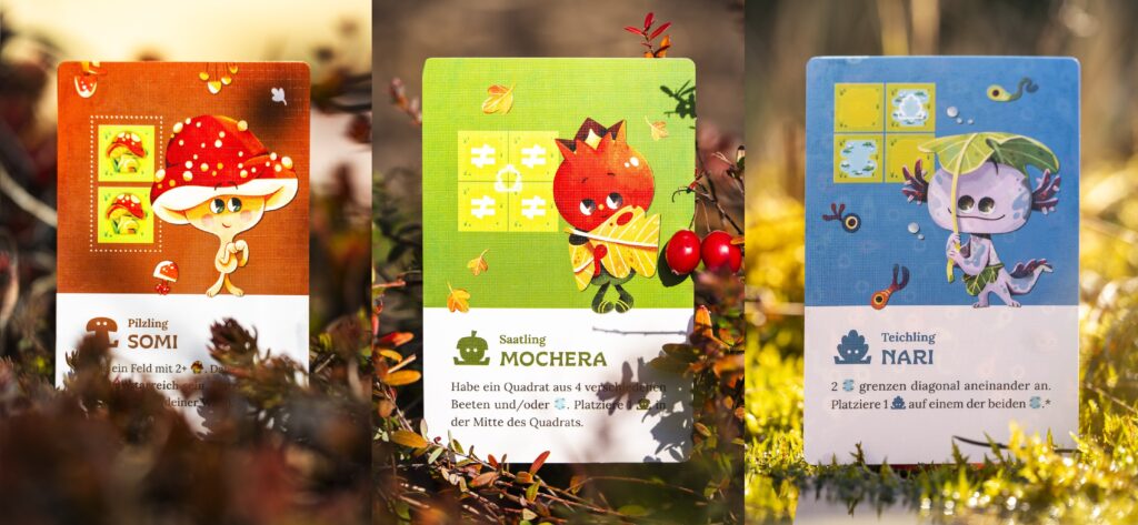 Beim Pflanzen wählst du ein Plättchen aus der offenen Auslage und legst dieses an deine Wiese an. Hierbei sind jedoch die Pflanzregeln zu beachten: Mindestens eine Seite des Plättchens muss vollständig an ein bereits ausgelegtes Plättchen angrenzen, sodass kein Gartenplättchen einzeln liegt. Hierbei darf eine Seite nicht an zwei unterschiedliche Plättchen angrenzen. Gartenplättchen dürfen dabei beliebig gedreht und gewendet werden. Am besten versuchst du, gleiche Beete zu verbinden- so entstehen größere Felder.