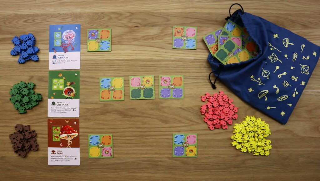 Bevor das Wuseln beginnen kann, bekommt jeder Spieler seine erste kleine Wiese, ein Start-Plättchen, das du vor dir platzierst. Die übrigen Gartenplättchen landen gut gemischt im Beutel. Zieht 3 davon und legt sie offen in die Tischmitte. Dazu kommen die Bienen-, Kolibri-, und Waldgeisterholzfiguren und je eine Wiesengeister-Karte pro Farbe.
