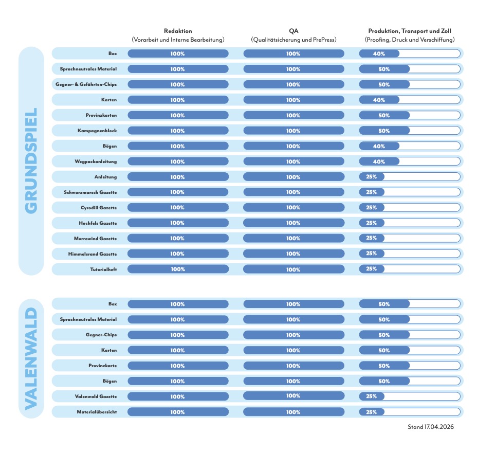 Alle Daten sind abgegeben. Chip Theory Games hat die Gazetten, Rulebook und Tutorialheft bereits gesichtet und wir haben die Updates dazu eingearbeitet. Viele Dinge sind im Eproof schon abgesegnet (in der Tabelle 50%), bei anderen warten wir noch auf die Eproofs (in der Tabelle 25%).