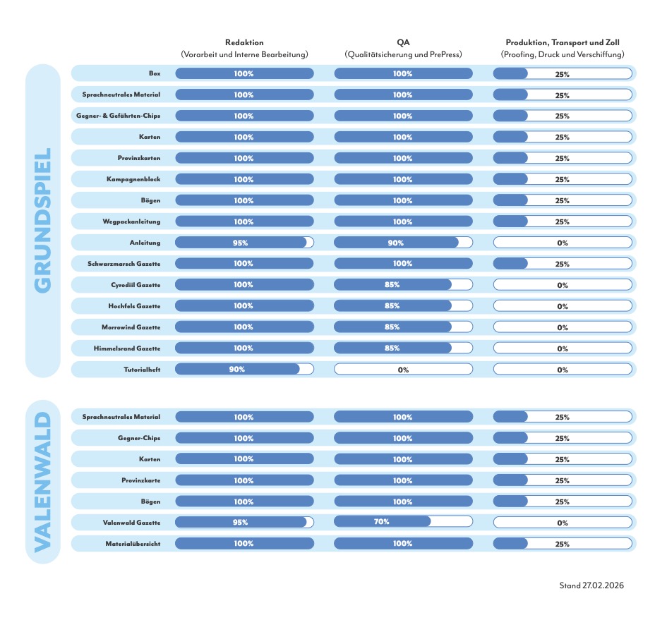 Gazettere befinden sich mittlerweile alle im Proofreading. Die Korrekturen und ersten Änderungen wurden daraufhin auch schon eingearbeitet. Das Tutorialheft hat noch mal eine Überarbeitung bekommen und geht am Montag in das finale Proofreading.