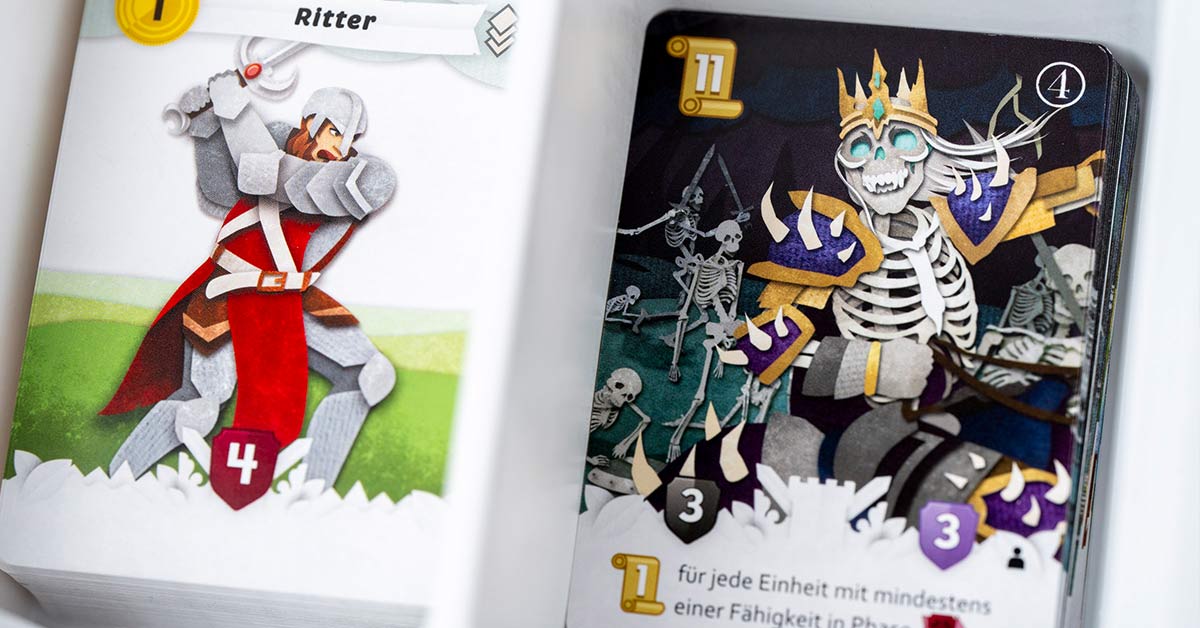 Klingt vertraut? War ja auch erst die halbe Geschichte: Der geniale Kniff an Paper Tales ist der Alterns-Mechanismus. Eure aufgebaute Engine hält nicht ewig, denn die Einheiten altern am Rundenende und sterben schließlich weg. Wer gewinnen will, muss das ständige Kommen und Gehen seiner Karten in seine Pläne mit einbeziehen und immer offen für neue Optionen und taktische Richtungswechsel bleiben.